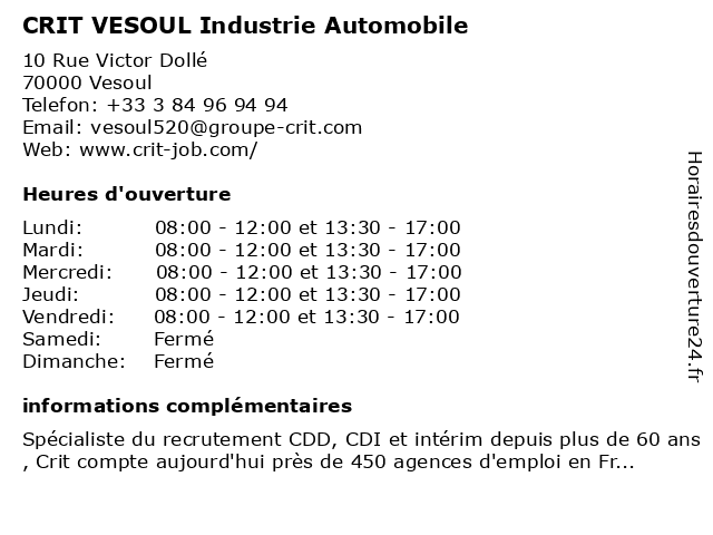 2 Chambre de Commerce et D'Industrie (Distance: 1,82 km) 27 Avenue Aristide-Briand, 70001 Vesoul administration, assoc, chambre, commerce, d'industrie, de, et, services, services publics 3 Adecco Onsite Automobile (Distance: 2,78 km) 53 Boulevard Charles de Gaulle, 70000 Vesoul adecco, agences, automobile, cdd, cdi, emploi, emploi intérim, onsite, services 4 Auto Securitas - Contrôle Technique Automobile Portusiens (Distance: 8,97 km) 4 rue de la Mognotte, 70170 Port-sur-Saône auto, automobile, contrôle, examen, portusiens, securitas, technique, visite, véhicule 5 Eurorepar - Garage Saône Automobile (Distance: 9,25 km) - Route de Bougnon, 70170 Port-sur-Saône automobile, automobiles, euro, eurorepar, garage, location de voiture, location de véhicules, motos, repar, saone, saône 6 Crit (Agence Intérim) (Distance: 26,33 km) 41 rue Carnot, 70300 Luxeuil Les Bains agence, crit, d'intérim, intérim |