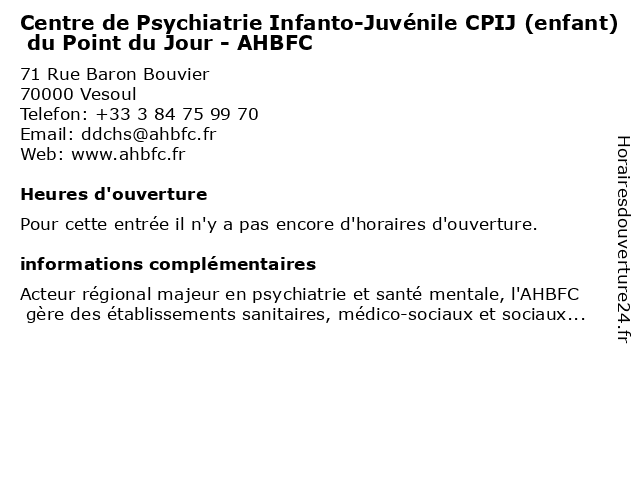 | Termes de recherche pour Centre de Psychiatrie Infanto-Juvénile CPIJ (enfant) du Point du Jour - AHBFC:du, de, point, centre, jour, enfant, psychiatrie, infanto, juvénile, ahbfc, cpij |