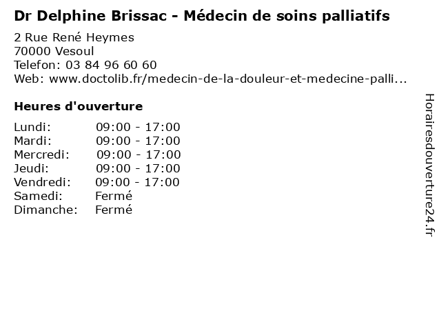 1 Dr Delphine Plaud - Pharmacien hospitalier (Distance: 0,05 km) 2 rue Heymès, 70014 Vesoul cachet, de, delphine, dr, groupe, haute, hospitalier, la, medicament, pharmacie, pharmacien, plaud, saône, site, vesoul 2 Centre de Soins Infirmiers Eliad (Distance: 0,48 km) 1 Rue des Haberges, 70000 Vesoul centre, de, eliad, infirmiers, soins 3 Dr Delphine Brissac - Médecin de soins palliatifs (Distance: 27,32 km) 12 rue Grammont, 70300 Luxeuil-les-Bains brissac, consultation, de, delphine, docteur, dr, med, médecin, médecine, palliatifs, soins, traitement 4 Dr Christophe Petitjean - Médecin de soins palliatifs (Distance: 27,32 km) 12 rue Grammont, 70300 Luxeuil-les-Bains christophe, consultation, de, docteur, dr, med, médecin, médecine, palliatifs, petitjean, soins, traitement 5 Dr Delphine Brissac - Médecin de soins palliatifs (Distance: 27,53 km) 37 rue Carnot, 70200 Lure brissac, consultation, de, delphine, docteur, dr, med, médecin, médecine, palliatifs, soins, traitement 6 Dr Christophe Petitjean - Médecin de soins palliatifs (Distance: 27,53 km) 37 rue Carnot, 70200 Lure christophe, consultation, de, docteur, dr, med, médecin, médecine, palliatifs, petitjean, soins, traitement |