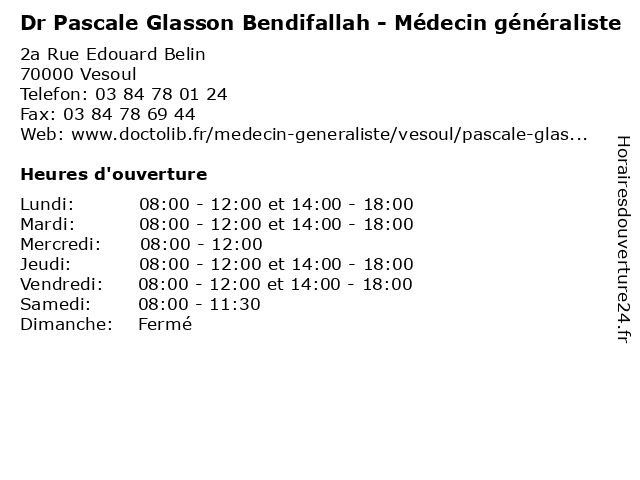 | Lundi | 08:00-12:00 et 14:00-18:00 |