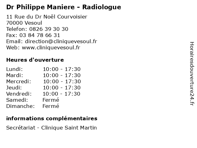 1 Dr Philippe Bloqueau - Radiologue (Distance: 0,00 km) 11 Rue du Dr Noël Courvoisier, 70000 Vesoul bloqueau, consultation, docteur, dr, med, medecine, medical, médecin, philippe, radiologue, traitement 2 Dr Christophe Maniere - Chirurgien ORL (Distance: 0,28 km) 2 rue Heymès, 70014 Vesoul chirurgien, christophe, de, dr, groupe, haute, hospitalier, la, laryngologie, maniere, orl, oto, rhino, saône, site, vesoul 3 Dr Philippe Daudey - Anesthésiste (Distance: 0,28 km) 2 rue Heymès, 70014 Vesoul anesthésiste, consultation, daudey, docteur, dr, med, medecine, medical, médecin, philippe, traitement 4 Dr Philippe Rolland - Médecin généraliste (Distance: 0,28 km) 2 rue Heymès, 70014 Vesoul consultation, docteur, dr, généraliste, med, medecine, medical, médecin, philippe, rolland, traitement 5 Dr Philippe Selles - Médecin généraliste (Distance: 0,31 km) 2 rue Heymès, 70014 Vesoul consultation, docteur, dr, généraliste, med, medecine, medical, médecin, philippe, selles, traitement 6 LASSUS-PHILIPPE Marie-Josèphe (Distance: 1,95 km) 19 Rue de la Banque, 70000 Vesoul josèphe, lassus, marie, philippe |