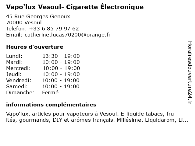1 J Well (Distance: 0,19 km) 25 Rue d'Alsace Lorraine, 70000 Vesoul des batteries, des bobines et des transports, e-cigarette box & accessoires : atomiseurs, well 2 Bar-Tabac Le Joker (Distance: 1,01 km) 76 Avenue Aristide Briand, 70000 Vesoul bar, carte, cigarette, fdj, grise, joker, journaux, le, presse, tabac 3 Vapo'Lux (Distance: 27,25 km) 7 rue du Docteur Gilles Cugnier, 70300 Luxeuil-les-Bains boutique, e-cigarettes, liquide, vapo'lux, électronique 4 Cigusto (Distance: 40,13 km) 6 Rue de Châtillon, 25480 École-Valentin cigarette, cigusto, e-liquide, électronique 5 Vapostore (Distance: 43,26 km) - avenue de la Paix, 25000 Besançon boutique, cigarette électronique, e-liquide, magasin, vapostore 6 Le coin des Vapers (Distance: 43,86 km) 7 rue de la république, 25000 Besançon accessoires., cigarette électronique, coin, des, le, liquides, mod, vapers |