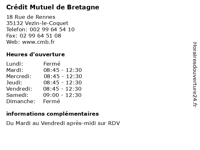 1 Crédit Mutuel de Bretagne (Distance: 7,04 km) . Route Saint Malo, 35760 Saint-Gregorie bretagne, cafe, chaussures, crédit, de, enfants, lingerie, mode hemmes, mode homme, mutuel, restaurant 2 Crédit Mutuel de Bretagne (Distance: 10,55 km) 1 Place du Docteur Joly, 35170 Bruz agence, assurances, bancaire, banque, banquier, bretagne, crédit, de, finance, mutuel, prêt 3 Crédit Mutuel de Bretagne (Distance: 16,62 km) 2 Rue du Fort de la Motte, 35690 Acigné assurances, banque, bretagne, crédit, de, mutuel 4 Crédit Agricole Mutuel Pyrénées Gascogne (Distance: 0,00 km) . Rue de Rennes, 35132 Vezin-le-Coquet agricole, assurances, bancaire, banque, crédit, gascogne, mutuel, pyrénées, services 5 Crédit Agricole Mutuel Pyrénées Gascogne (Distance: 10,66 km) 61 Avenue André Bonnin, 35135 Chantepie agricole, assurances, bancaire, banque, crédit, gascogne, mutuel, pyrénées, services 6 Crédit Agricole Mutuel Pyrénées Gascogne (Distance: 11,01 km) . Beauséjour, 35520 La Meziere agricole, assurances, bancaire, banque, crédit, gascogne, mutuel, pyrénées, services |