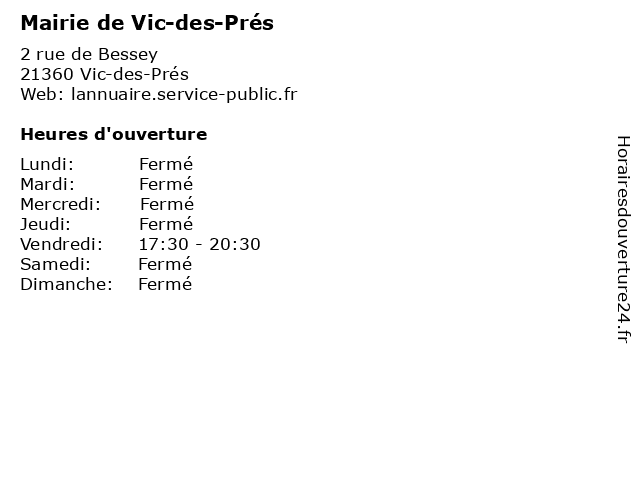 1 Mairie de Vic-des-Prés (Distance: 0,56 km) 2 rue de Bessey, 21360 Vic-des-Prés administration, assoc public, de, des, mairie, prés, service, vic 2 Mairie d'Antigny-la-Ville (Distance: 5,73 km) - Le Bourg, 21230 Antigny-la-Ville administration, d'antigny, la, mairie, public, service, ville 3 Mairie de Baubigny (Distance: 6,70 km) n/a Grande rue, 21340 Baubigny administration, assoc, associations, aux, baubigny, bussières, d'information, de, des, dédié, greffe, information, local, locale, mairie, mission, personnes, point, services, services publics 4 Mairie d'Ivry-en-Montagne (Distance: 8,00 km) n/a Grande Rue, 21340 Ivry-en-Montagne administration, d'ivry, en, mairie, montagne, service public 5 Mairie de Val-Mont (Distance: 8,00 km) 1 rue de la Mairie, 21340 Val-Mont administration, de, mairie, mont, publique, service, val 6 Mairie de Santosse (Distance: 11,02 km) - Rue de l'Église, 21340 Santosse administration, de, mairie, santosse, service public |