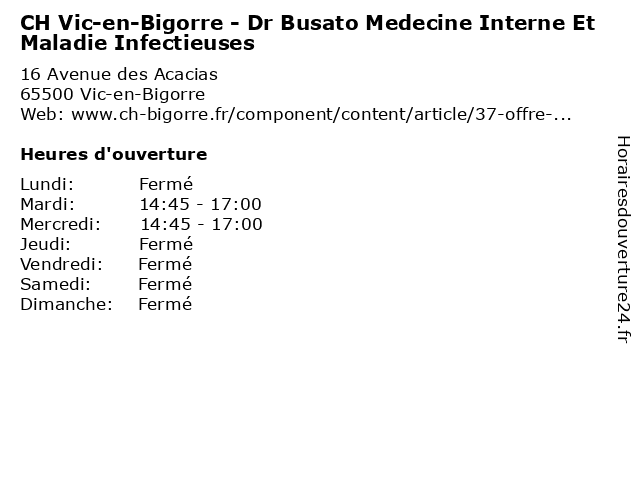 Termes de recherche pour CH Vic-en-Bigorre - Dr Busato Medecine Interne Et Maladie Infectieuses:en, et, bureau, med, medecine, maladie, vic, ch, traitement, interne, bigorre, médecin, consultation, dr, pratique, therapie, infectieuses, busato |
