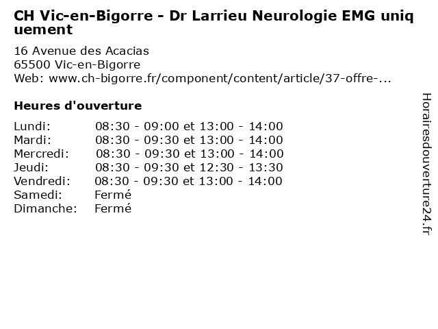 Termes de recherche pour CH Vic-en-Bigorre - Dr Larrieu Neurologie EMG uniquement:en, bureau, med, medecine, maladie, vic, emg, ch, traitement, uniquement, neurologie, bigorre, médecin, consultation, dr, larrieu, pratique, therapie |