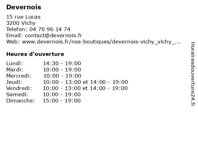 1 Devernois (Distance: 46,98 km) 10 Rue du Maréchal Foch, 63000 Clermont-Ferrand accessoires, devernois, femme, mode, vêtements 2 Devernois (Distance: 53,06 km) 13 Boulevard des Etines, 42120 Le Coteau accessoires, devernois, femme, mode, vêtements 3 IKKS Women (Distance: 0,01 km) 15 Rue Lucas, 03200 Vichy bebe, boutique, enfants, homme, ikks, mode femme, women 5 Maison 123 (Distance: 0,02 km) 10-14 Rue Lucas, 03200 Vichy 123, accessoires, chaussures, maison, maroquinerie, mode 6 IKKS Junior (Distance: 0,03 km) 12 Rue Lucas, 03200 Vichy bebe, boutique, enfants, homme, ikks, junior, mode femme |