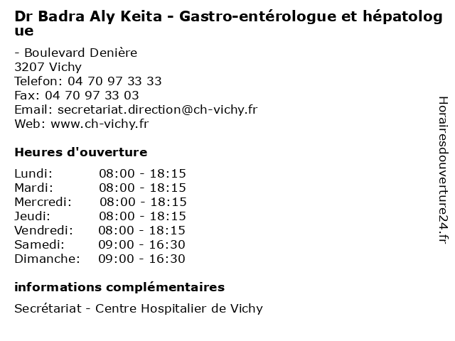 1 Dr Jocelyn Privat - Gastro-entérologue et hépatologue (Distance: 0,00 km) - Boulevard Denière, 03207 Vichy consultation, docteur, dr, entérologue, et, gastro, hépatologue, jocelyn, med, médecin, médecine, privat, traitement 2 Dr Houria Demmak - Gastro-entérologue et hépatologue (Distance: 0,00 km) - Boulevard Denière, 03207 Vichy consultation, demmak, docteur, dr, entérologue, et, gastro, houria, hépatologue, med, médecin, médecine, traitement 3 Dr Anne-Laure Boucher - Gastro-entérologue et hépatologue (Distance: 36,26 km) 73 Boulevard Etienne Clémentel, 63200 Riom anne, boucher, docteur, dr, entérologue, et, gastro, generaliste, hépatologue, laure, medecin, sante 4 Medecin François Bouculat (hépatologue) (Distance: 36,28 km) 73 Boulevard Etienne Clementel, 63200 Riom bouculat, docteur, françois, hépatologue, medecin, sante, services 5 Medecin Emmanuelle Cruzille (hépatologue) (Distance: 36,28 km) 73 Avenue Etienne Clementel, 63200 Riom cruzille, docteur, emmanuelle, hépatologue, medecin, sante, services 6 Dr François-Alain Rance - Gastro-entérologue et hépatologue (Distance: 45,54 km) 105 Avenue de la République, 63100 Clermont-Ferrand alain, consultation, docteur, dr, entérologue, et, francois, françois, gastro, hépatologue, med, médecin, médecine, rance, traitement |
