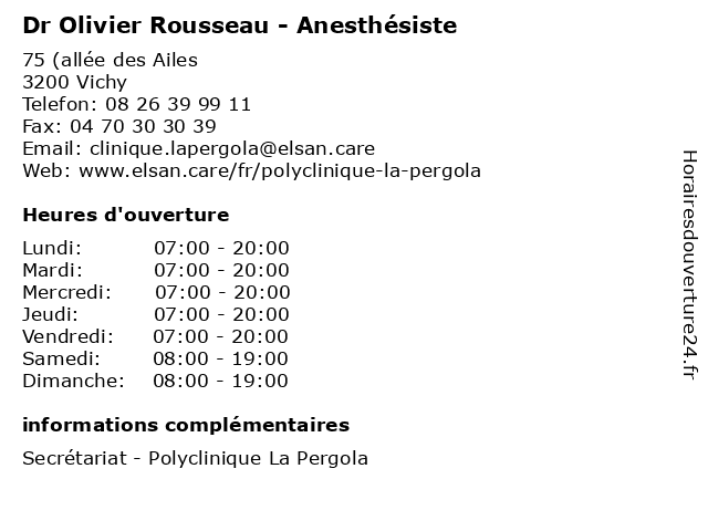 1 Dr Katerina Grossmannova - Anesthésiste (Distance: 0,00 km) 75 allée des Ailes, 03200 Vichy anesthésiste, consultation, docteur, dr, grossmannova, katerina, med, médecin, médecine, traitement 2 Dr Pascal Duchêne - Anesthésiste (Distance: 0,00 km) 75 allée des Ailes, 03200 Vichy anesthesiste, anesthésiste, consultation, docteur, dr, duchêne, med, médecin, médecine, pascal, traitement 3 Sarl Mercier Olivier (Distance: 1,11 km) 183 route de Charmeil, 03300 Cusset bois, chauffage, cheminées, entretien, mercier, olivier, plomberie, poêles, sarl 4 Dr Olivier Martin - ORL - secrétariat (Distance: 2,11 km) 2B Boulevard Maréchal de Lattre de Tassigny, 03200 Vichy chirurgien, consultation, cou, de, docteur, dr, du, et, face, la, martin, med, médecin, médecine, olivier, orl, secrétariat, traitement 5 Dulac Olivier Fabrice (Distance: 2,30 km) 16 Rue De La Fontaine, 03300 Creuzier Le Vieux dulac, fabrice, olivier, restaurants 6 |