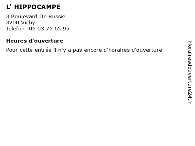 1 Restaurant L'Hippocampe (Distance: 0,13 km) 3 Boulevard de Russie, 03200 Vichy gastronomique, hippocampe, l'hippocampe, restaurant, restauration 2 Hippocampe H'Val, Centre équestre poney club de Larequille (Distance: 56,93 km) 676 Route de Bel Air, 03310 Durdat-Larequille centre, club, de, h'val, hippocampe, larequille, poney, équestre |