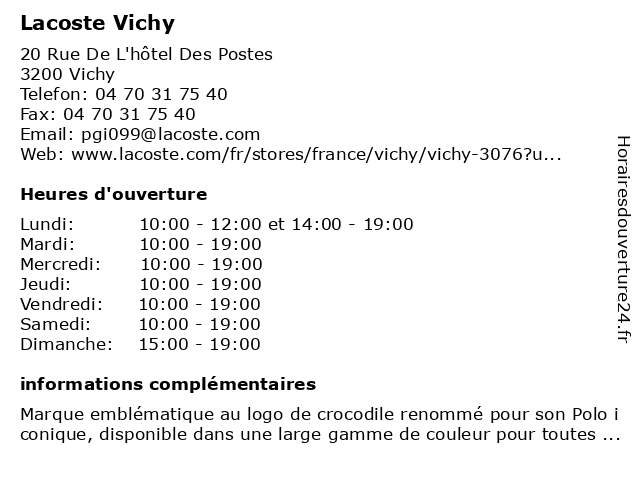 Termes de recherche pour Lacoste Vichy:vichy, maroquinerie, lacoste, articles de sport, magasin de chaussures, magasin de vêtements pour enfants, magasin de vêtements pour hommes, magasin de vêtements pour femmes, magasin de vêtements de sport, magasin d’accessoires de mode |