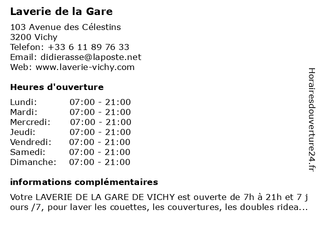 2 Gare de Vichy - guichet (Distance: 0,13 km) - place de la Gare, 03200 Vichy commun, de, en, ferroviaire, gare, guichet, sncf, ter, tgv, train, transports, vichy 3 Gare de Vichy - Guichet (Distance: 0,13 km) - place de la Gare, 03200 Vichy commun, de, en, ferroviaire, gare, guichet, sncf, ter, tgv, train, transports, vichy 4 Parking gare de Vichy - EFFIA (Distance: 0,23 km) 7 Boulevard de l'Hôpital, 03200 Vichy de, effia, gare, parking, vichy 5 Laverie Wash'n Dry (Distance: 2,37 km) s/n Rue de la Barge, 03300 Cusset dry, laverie, nettoyeur à sec, service, vêtements, wash'n 6 |