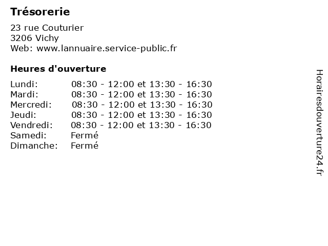1 Trésorerie (Distance: 17,74 km) 20 avenue Delarue, 03800 Gannat administration, assoc, services, services publics, trésorerie 2 Centre Des Impôts - Vichy Trésorerie (Distance: 0,00 km) 23 Rue Couturier, 03200 Vichy administration, centre, des, impôts, services publics, trésorerie, vichy 3 Trésorerie de Bellerive-sur-Allier (Distance: 1,44 km) 20B Avenue De Russie, 03700 Bellerive-sur-Allier allier, bellerive, bellerive-sur-allier, de, public, sur, trésor, trésorerie 4 Trésorerie de Gannat (Distance: 17,74 km) 20 Avenue Delarue, 03800 Gannat de, gannat, public, trésor, trésorerie 5 Trésorerie de Luzillat (Distance: 19,20 km) . Route de Vendègre, 63350 Luzillat de, luzillat, public, trésor, trésorerie 6 Centre Des Impôts - Saint Pourcain Sur Sioule Trésorerie (Distance: 26,43 km) 3 Rue Croix Des Vignes, 03450 Ébreuil centre, des, impôts, pourcain, publics, saint, services, sioule, sur, trésorerie  |