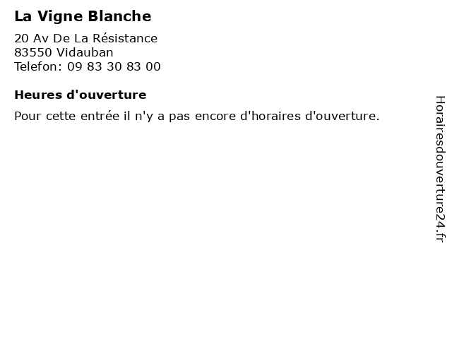 1 La Vigne Blanche (Distance: 0,82 km) 3 Place Clemenceau, 83550 Vidauban bey, blanche, philippe, restaurants, vigne 2 La Bastide Blanche (Distance: 17,92 km) Quartier Le Brusquet, 83310 Grimaud bastide, blanche, jamia, restaurants 3 Les Ecuries de l'Eau Blanche (périodes scolaires) (Distance: 27,75 km) 1 Avenue de l'Eau Blanche, 83240 Cavalaire-sur-Mer blanche, club, de, ecuries, equitation, l'eau, les, périodes, scolaires, sport, sportif, sports 4 Hôtel Terre Blanche (Distance: 30,99 km) 3100 Route de Bagnols-en-Forêt, 83440 Tourrettes blanche, cuisine, hotel, hôtel, restaurant, spa, séjour, terre, vacances 5 Green Acres - Sas Terre Blanche Immobilier (Distance: 32,01 km) 104 Grandes Terrasses, 83440 Tourrettes acres, agency, agent, apartment, blanche, green, home, immobilier, real estate, sas, terre 6 Palluel Valerie Blanche Edith (Distance: 48,57 km) Batiment 1a Residence Les Pins, 06110 Le Cannet blanche, directe, edith, palluel, valerie, vente |