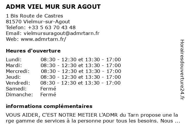 1 ADMR VIELMUR SUR AGOUT (Distance: 0,00 km) 1 Bis Route de Castres, 81570 Vielmur-sur-Agout admr, agout, sur, vielmur 3 ADMR SERVIES-GUITALENS-LALBAREDE (Distance: 6,90 km) 3 Place du 19 Mars 1962, 81220 Serviès admr, guitalens, lalbarede, servies 6 ADMR SSIAD EN PAYS DE COCAGNE (Distance: 9,76 km) 6 Rue d'Orcières, 81700 Puylaurens admr, cocagne, de, en, pays, ssiad |