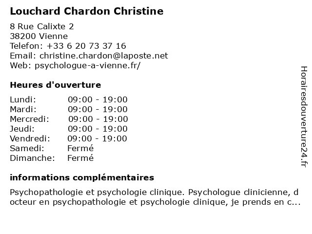 1 Dr Marine Chardon - Médecin généraliste (Distance: 0,47 km) 33 quai Riondet, 38200 Vienne chardon, docteur, dr, généraliste, marine, médecin, santé 2 Kalman Christine Francoise (Distance: 3,30 km) 5 Rue Viollet Le Duc, 38200 Vienne christine, francoise, kalman, restaurants 3 Christine Coiffure (Distance: 5,92 km) 399 Rue du Perrin, 69700 Loire-sur-Rhône beauté, christine, coiffure, coiffures, coloristes 4 Dr Noemie Chardon - Médecin généraliste (Distance: 9,61 km) 47 Rue de Chassagne, 69360 Ternay chardon, docteur, dr, generaliste, généraliste, medecin, médecin, noemie, soins 5 Christine Delloye - Psychologue (Distance: 12,35 km) 21a Rue Centrale, 69360 Saint-Symphorien-d'Ozon christine, delloye, folie, psychiatre, psychiatrie, psychiatrique, psychologue 6 Marie-Christine Sorrente Noel - Ostéopathe (Distance: 15,63 km) 1 Allée des Ifs, 69960 Corbas christine, marie, noel, ostéo, ostéopathe, ostéopathes, soins, sorrente |