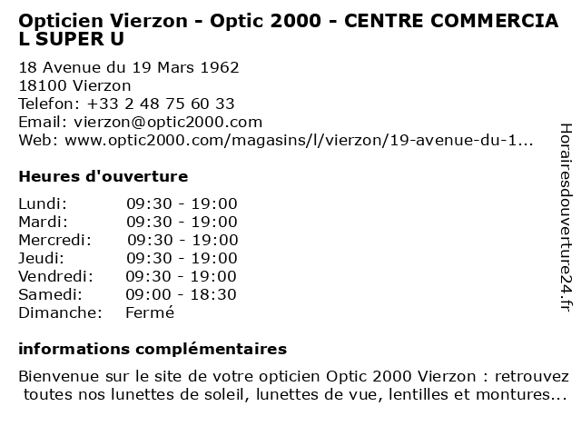 2 Opticien VIERZON Optical Center (Distance: 0,18 km) Chemin de l'Ardillat, 18100 Vierzon center, optical, opticien, vierzon 3 Optic 2000 (Distance: 0,51 km) 18 Avenue du 19 Mars 1962, 18100 Vierzon 2000, lunettes, optic, santé, solaires 4 Super U Location (Distance: 0,51 km) 18 Avenue Du 19 Mars 1962, 18100 Vierzon location, super, transport, utilitaire, véhicule 5 Opticien Vierzon | Alain Afflelou (Distance: 2,69 km) 5 Place Aristide Briand, 18100 Vierzon afflelou, alain, magasin de lunettes de soleil, magasin d’accessoires de mode, opticien, optométrie, vierzon 6 Opticien Krys (Distance: 2,71 km) 9 Avenue De La République, 18100 Vierzon krys, magasin de lentilles correctrices, magasin de lunettes de soleil, magasin d’accessoires de mode, opticien, optométrie |