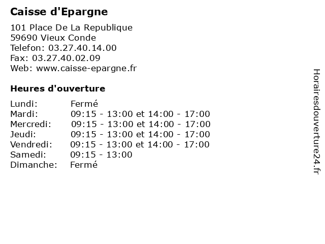 1 Caisse d'Epargne (Distance: 2,77 km) 26 Rue Jean Jaures, 59970 Fresnes sur Escaut banque, caisse, carte, d'epargne, services 2 Caisse d'Epargne (Distance: 8,23 km) 226 Rue Jean Jaurès, 59264 Onnaing banque, caisse, carte, d'epargne, services 3 Caisse d'Epargne (Distance: 9,12 km) 12 Place Du 11 Novembre, 59192 Beuvrages banque, caisse, carte, d'epargne, services 4 Caisse d'Epargne (Distance: 11,27 km) 31 Avenue Georges Clemenceau, 59306 Valenciennes banque, caisse, carte, d'epargne, services 5 Caisse D'epargne (Distance: 12,02 km) 2 Place Dampierre, 59300 Valenciennes banque, caisse, carte, d'epargne, services 6 Caisse d'Epargne (Distance: 12,46 km) 43 Avenue De Reims, 59300 Valenciennes banque, caisse, carte, d'epargne, services |