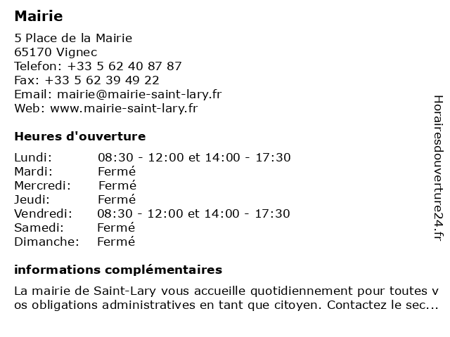 4 Mairie (Distance: 13,31 km) n/a Le Village, 65240 Ardengost administration, mairie, service, services publics, trésorerie 6 |