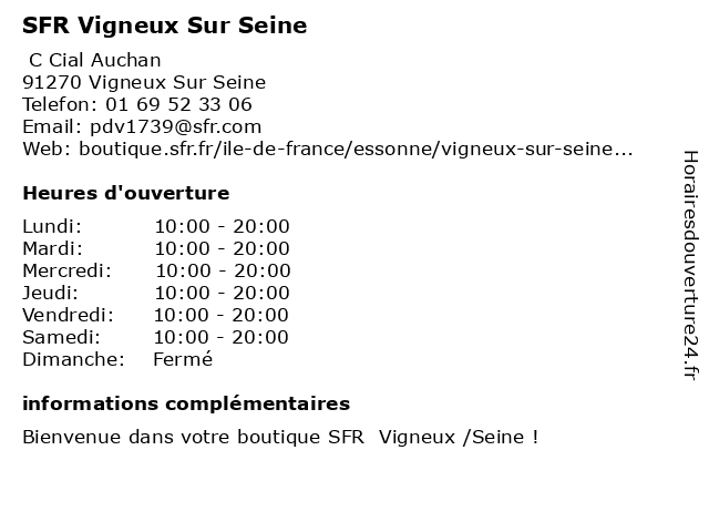 Termes de recherche pour SFR Vigneux Sur Seine:sur, seine, sfr, vigneux, compagnie de téléphone, vente et installation du câble et du satellite, magasin de téléphones mobiles |