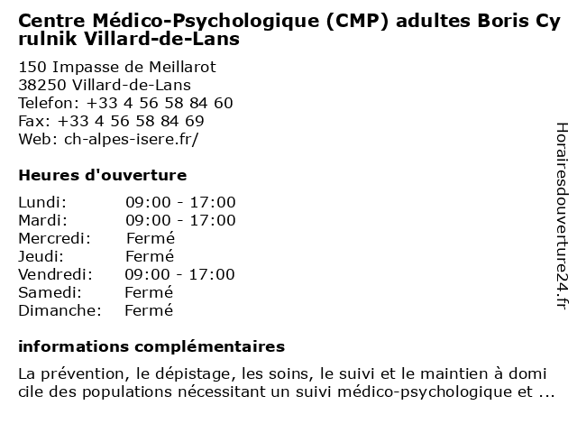 1 Centre Médico-Psychologique (CMP) enfants Boris Cyrulnik Villard-de-Lans (Distance: 0,00 km) 150 Impasse de Meillarot, 38250 Villard-de-Lans boris, centre, cmp, cyrulnik, de, enfants, lans, médico, psychologique, villard 2 Centre Médico-Psychologique (CMP) adultes Vif (Distance: 8,94 km) 10 Rue du Breuil, 38450 Vif adultes, centre, cmp, médico, psychologique, vif 3 Centre Médico-Psychologique (CMP) (Distance: 12,47 km) 8 cours Saint-André, 38800 Pont-de-Claix centre, cmp, consultation, docteur, med, medecine, medical, médecin, médico, psychologique, traitement 4 Centre Médico-Psychologique (CMP) enfants Seyssinet-Pariset (Distance: 14,71 km) 55 Rue de Cartale, 38170 Seyssinet-Pariset centre, cmp, enfants, médico, pariset, psychologique, seyssinet 5 Institut Médico-Educatif (Distance: 15,04 km) 28 avenue Grugliasco, 38130 Echirolles accompagnement personnalisé, educatif, institut, médico, établissement médico-social 6 Centre Médico-Psychologique (CMP) enfants Fontaine (Distance: 16,20 km) 2 Boulevard Paul Langevin, 38600 Fontaine centre, cmp, enfants, fontaine, médico, psychologique |