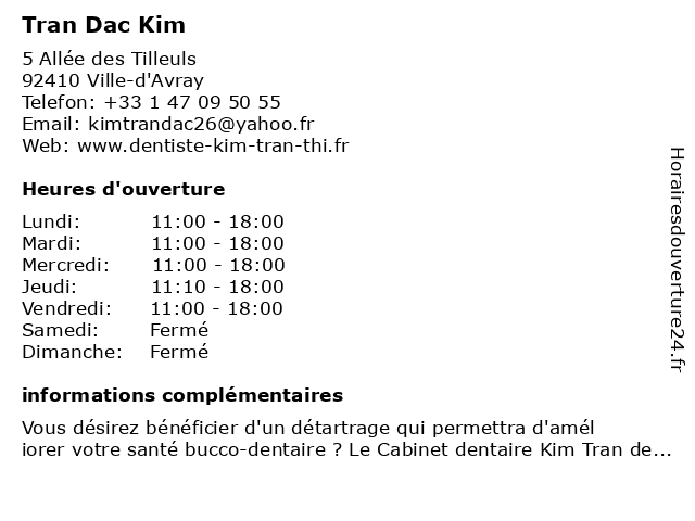 1 Restaurant Kim Yang (Distance: 1,29 km) 536 Avenue Roger Salengro, 92370 Chaville kim, nourriture, restaurant, restaurants, yang 2 Dr Kim Son - Médecin du travail (Distance: 4,23 km) 15 rue Boileau, 78000 Versailles consultation, docteur, dr, du, kim, med, médecin, son, traitement, travail 3 Restaurant Japonais Kim (Distance: 5,39 km) 47 Rue des Peupliers, 92100 Boulogne cuisine, japonais, kim, restaurant, restauration, spécialités, sushi 4 Restaurant Kim Anh Restaurant (Dîner) (Distance: 7,70 km) 49 Avenue Emile Zola, 75015 Paris anh, beer, café, crêpes, dessert, dîner, kim, restaurant, wine 6 Adidas/Kim & Kim (Distance: 11,20 km) 69 Rue des Saints Pères, 75006 Paris adidas/kim, chaussures, kim, les chaussures, les hommes, les marques de sport |