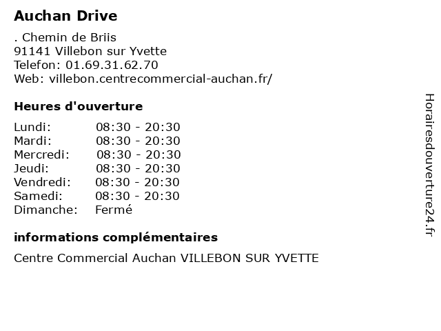 1 Auchan Drive (Distance: 4,65 km) . Route de Villejust, 91620 Nozay auchan, drive, hypermarche, marche, market 2 Auchan Drive (Distance: 8,84 km) 2 Avenue De I'Europe, 78945 Velizy auchan, drive, hypermarche, marche, market 3 Auchan Drive (Distance: 13,51 km) . Avenue de la Maison Neuve, 91227 Bretigny sur Orge auchan, beaute, boutiques, chaussures, deco, drive, enfants, mode femme, mode hommes, restaurant, sport 4 Auchan Drive (Distance: 13,65 km) . Rue Mercure, 91230 Montgeron auchan, drive, hypermarche, marche, market 5 Auchan Services (Distance: 0,00 km) . Chemin de Briis, 91141 Villebon sur Yvette auchan, beaute, boutiques, brasserie, cache, chaussures, concorde, deco, enfants, le, mode femme, mode hommes, restaurant, rocher, services, sport 6 Stations-Service Auchan (Distance: 0,00 km) . Chemin de Briis, 91141 Villebon sur Yvette auchan, beaute, boutiques, brasserie, cache, chaussures, concorde, deco, enfants, le, mode femme, mode hommes, restaurant, rocher, service, sport, stations |