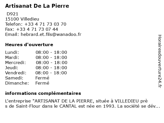 1 Chambre de Métiers et de l'Artisanat de la Haute-Loire à Brioude (Distance: 41,56 km) Avenue Léon Blum, 43100 Brioude brioude, chambre, de, et, haute, l'artisanat, la, loire, métiers 2 Chambre de métiers et de l'artisanat (CMA) (Distance: 48,26 km) 45 Avenue de la République, 15005 Aurillac administration, assoc, chambre, cma, de, et, l'artisanat, métiers, services, services publics 3 Chambre de Métiers et de l'Artisanat du Cantal (Distance: 49,68 km) 14 Avenue du Garric, 15000 Aurillac cantal, chambre, de, du, et, l'artisanat, métiers 4 Pascal et Fils SAS (Distance: 0,47 km) - Rue des Carrières Ribeyrevieille, 15100 Villedieu et, fils, marbrerie, pascal, pierre, plan de travail, sas, taille 5 Restaurant L' Auberge Du Château (Distance: 2,33 km) le bourg, 15100 Les Ternes auberge, chantal, chateau, château, crozatier, du, l', pierre, pierrette, restaurant, restaurants 6 Dr Pierre Mouraire - Pneumologue (Distance: 4,62 km) 2 Avenue du Docteur Mallet, 15100 Saint-Flour consultation, docteur, dr, med, mouraire, médecin, médecine, pierre, pneumologue, traitement |
