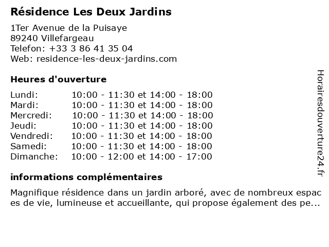 | Samedi | 10:00-11:30 et 14:00-18:00 |