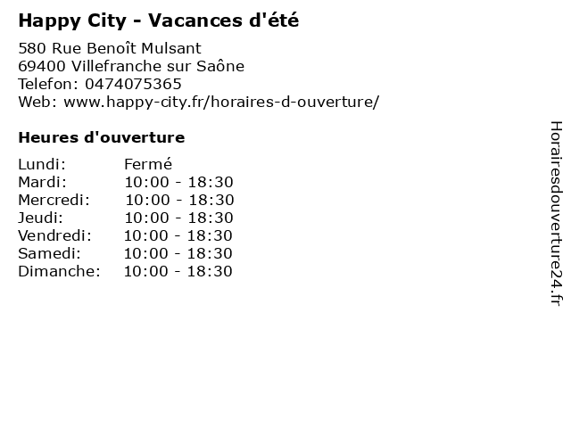 1 Happy City - Hors vacances (Distance: 0,00 km) 580 Rue Benoît Mulsant, 69400 Villefranche sur Saône city, happy, hors, loisirs, parc, vacances 2 Happy City - Vacances scolaires zone A (Distance: 0,00 km) 580 Rue Benoît Mulsant, 69400 Villefranche sur Saône city, happy, loisirs, parc, scolaires, vacances, zone 3 Happy Coiffure (Distance: 1,90 km) 101 Rue Paul Bert, 69400 Villefranche-sur-Saône beauté, brushing, coiffeur, coiffure, coloration, coupe, happy 4 Déchèterie (Été) (Distance: 5,58 km) - Avenue Lossburg, 69480 Anse déchèterie, gravats, huiles usées, la réception des déchets et écocentres, les appareils électroménagers, les déchets verts, papier et carton en quantité, été 5 Déchèterie (Été) (Distance: 12,11 km) - ZI de Pain Perdu, 69220 Belleville-en-Beaujolais bennes, déchets, déchèterie, détritus, gravats, été 6 Déchèterie (Été) (Distance: 13,54 km) - Route de Saint Antoine, 69380 Chazay-d'Azergues déchèterie, gravats, huiles usées, la réception des déchets et écocentres, les appareils électroménagers, les déchets verts, papier et carton en quantité, été |