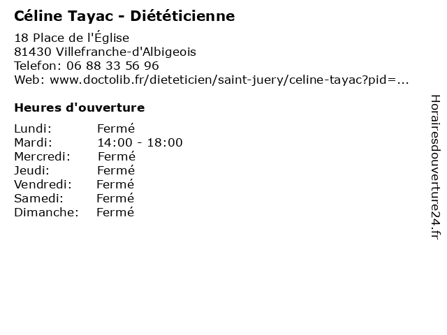1 Céline Tayac - Diététicienne (Distance: 10,06 km) 1 Rue du Sénateur Boularan, 81250 Alban alimentation, céline, dieteticien, diététicienne, nourriture, sante, tayac 2 Céline Tayac - Diététicienne (Distance: 11,37 km) - Rue des Aciéries, 81160 Saint-Juéry alimentation, celine, céline, dieteticien, diététicienne, nourriture, sante, tayac 3 Léa Mottes - Diététicienne (Distance: 14,38 km) 7 Place de l'Horloge, 81380 Lescure-d'Albigeois alimentation, dieteticien, diététicienne, léa, mottes, nourriture, sante 4 Marion Drozd - Diététicienne (Distance: 16,37 km) 72 Rue Angély Cavalié, 81000 Albi alimentation, dieteticien, diététicienne, drozd, marion, nourriture, sante 5 Céline Boucault - psychologue clinicienne (Distance: 17,99 km) place Henry Dunant, 81120 Réalmont boucault, clinicienne, céline, psychologue 6 Dr Céline Auret - Médecin généraliste (Distance: 26,26 km) 1 Rue de la Rodé, 81440 Lautrec auret, céline, dr, généraliste, médecin, médecine, médical, pharmaceutique, traitement |