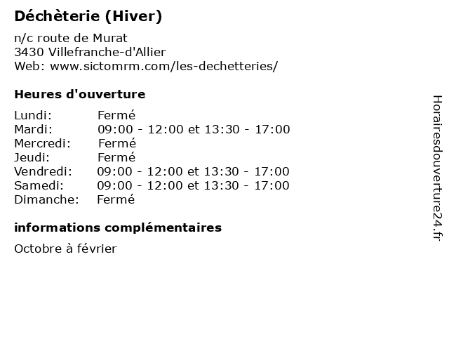 1 Déchèterie (Hiver) (Distance: 9,86 km) - route de Villefranche, 03390 Montmarault bennes, déchets, déchèterie, détritus, gravats, hiver 2 Déchèterie (Hiver) (Distance: 10,53 km) - lieu-dit Le Champ de l'Etang, 03430 Cosne-d'Allier bennes, déchets, déchèterie, détritus, gravats, hiver 3 Déchèterie (Hiver) (Distance: 12,92 km) - Rue du Silo, 03240 Tronget 1er, du, déchetterie, déchèterie, fin, février, hiver, novembre, sictom, tronget 4 Déchèterie (Hiver) (Distance: 16,97 km) - route de Colombier, 03600 Commentry bennes, déchets, déchèterie, détritus, gravats, hiver 5 Déchèterie (Été) (Distance: 0,00 km) n/c route de Murat, 03430 Villefranche-d'Allier bennes, déchets, déchèterie, détritus, gravats, été 6 Déchèterie (Été) (Distance: 9,86 km) - route de Villefranche, 03390 Montmarault bennes, déchets, déchèterie, détritus, gravats, été |