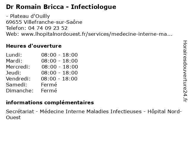 1 Dr Gary David - Infectiologue (Distance: 0,00 km) - Plateau d'Ouilly, 69655 Villefranche-sur-Saône consultation, david, docteur, dr, gary, infectiologue, med, médecin, médecine, traitement 2 Dr Carole Pietropaoli - Infectiologue (Distance: 0,00 km) - Plateau d'Ouilly, 69655 Villefranche-sur-Saône carole, consultation, docteur, dr, infectiologue, med, médecin, médecine, pietropaoli, traitement 3 Dr Romain Javourez - Ophtalmologue (Distance: 1,31 km) 120 Ancienne Route de Beaujeu, 69400 Arnas docteur, dr, generaliste, javourez, medical, ophtalmologue, romain, soin 4 Dr. Romain Michel - Radiologue (Distance: 1,31 km) 120 Ancienne Route de Beaujeu, 69400 Arnas consultation, docteur, dr., med, michel, médecin, médecine, radiologue, romain, traitement 5 Dr Romain Gaillard - Chirurgien orthopédiste (Distance: 1,31 km) 120 Ancienne Route de Beaujeu, 69400 Arnas chirurgien, dr, gaillard, medecin, ortho, orthoptiste, orthopédiste, romain, sante 6 Dr. Romain Michel - Radiologue (Distance: 5,28 km) 50 avenue Léon Marie Fournet, 01480 Jassans Riottier consultation, docteur, dr., med, michel, médecin, médecine, radiologue, romain, traitement |
