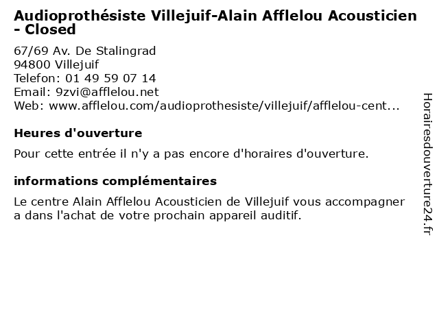 Termes de recherche pour Audioprothésiste Villejuif-Alain Afflelou Acousticien - Closed:villejuif, alain, afflelou, acousticien, audioprothésiste, closed, audiologie, clinique médicale |