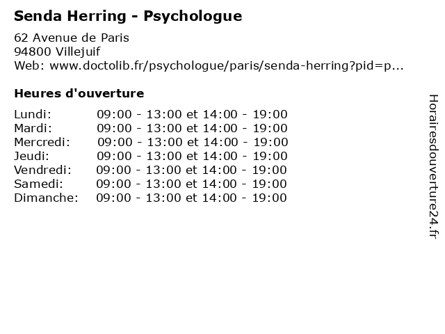 1 Senda Herring - Psychologue (Distance: 6,72 km) 34 Rue de l'Abbé Groult, 75015 Paris addictions, anxiété, autisme, dépression, herring, psy, psychiatre, psychologue, sante, senda, soins, tcc, toc, trauma 2 Dr Senda Khodja - Chirurgien-dentiste (Distance: 6,88 km) 100 Rue Saint-Denis, 75001 Paris chirurgien, consultation, dentiste, docteur, dr, khodja, med, médecin, senda, traitement 3 Dr Senda Khodja - Chirurgien-dentiste (Distance: 8,67 km) 124 bis Boulevard de Magenta, 75010 Paris chirurgien, consultation, dentiste, docteur, dr, khodja, med, médecin, senda, traitement 4 Senda Baccar - Naturopathe (Distance: 9,57 km) 36 Rue de la République, 92190 Meudon baccar, docteur, naturopathe, sante, senda, soins 5 Maître Sylvain Senda - Avocat (Distance: 13,12 km) 45 Boulevard Pasteur, 93120 La Courneuve avocat, avocats, civils, droits, juridiques, maître, senda, sylvain 6 Sophie Tripon - Psychologue (Distance: 0,00 km) 62 Avenue de Paris, 94800 Villejuif psy, psychiatre, psychologue, sante, soins, sophie, tripon |