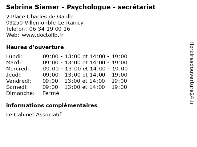 | Lundi | 09:00-13:00 et 14:00-19:00 |