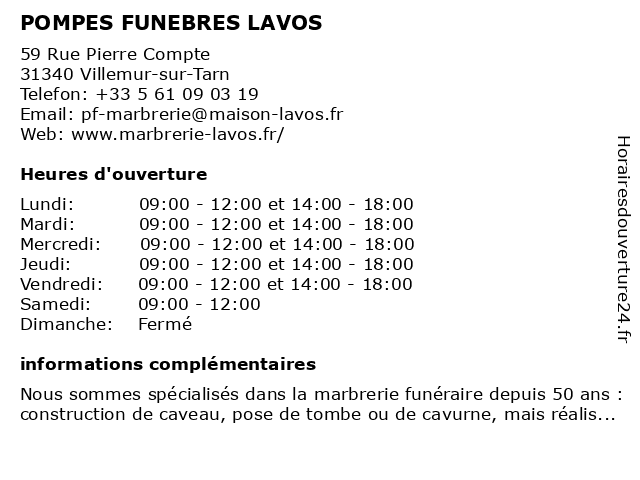 1 Pompes Funèbres Villemuriennes (Distance: 0,33 km) 15 Avenue Michel Rocard, 31340 Villemur-sur-Tarn funèbres, pompes, villemuriennes 2 Marbrerie Lavos Escourbiac Aujoulet (Distance: 3,28 km) 6 Route de Varennes, 31340 Villemur sur Tarn articles, aujoulet, escourbiac, funèbres, funéraires, lavos, marbrerie, marbrier, pompes, service 3 Pompes funèbres Sarasar (Distance: 9,17 km) 8 Chemin Labelle, 31620 Gargas chambre funéraire, funèbres, marbrerie, organisation d'obsèques, pompes, sarasar 4 Pompes Funèbres et Marbrerie BARRUÉ - PFG SAINT-JORY (Distance: 15,11 km) 42 Bis Route de Paris, 31790 Saint-Jory avis de décès, barrué, crémation, entretien de sépulture, et, fleurs deuil, formalités après obsèques, funèbres, inhumation, jory, marbrerie, monument funéraire, pfg, pompes, pompes funèbres, prévoyance obsèques, saint 5 Pompes Funèbres Mandou Saint-Alban - Funérarium Toulouse Nord (Distance: 16,92 km) 8 Rue Jean Rouquette, 31140 Saint-Alban alban, funèbres, funérarium, mandou, nord, pompes, saint, toulouse 6 |