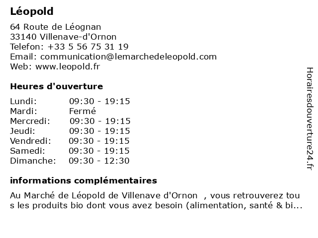 1 Le Marché de Léopold - Villenave d'Ornon (Distance: 0,01 km) 64 Route de Léognan, 33140 Villenave-d'Ornon cosmétique bio, d'ornon, de, le, les comptoirs de la bio, léopold, magasin bio, magasin bio 33, magasin bio 33140, magasin bio villenave-d'ornon, magasin bio à proximité, marché, villenave, vrac 2 Marché à Villenave-d'Ornon (Distance: 2,05 km) . Place Briand, 33140 Villenave-d'Ornon d'ornon, frutas, hortalizas, marché, mercado, verduras, villenave 3 Marché à Gradignan (Distance: 2,64 km) . Rue de Rochefort, 33170 Gradignan frutas, gradignan, hortalizas, marché, mercado, verduras 4 Marché place César Franck à Bègles (Distance: 4,10 km) . Place César Franck, 33130 Begles bègles, césar, franck, frutas, hortalizas, marché, mercado, place, verduras 5 Marché à Castets (Distance: 5,04 km) . Ville, 40260 Castets castets, frutas, hortalizas, marché, mercado, verduras 6 Marché place du XIV Juillet à Bègles (Distance: 5,25 km) . Place du XIV Juillet, 33130 Begles bègles, du, frutas, hortalizas, juillet, marché, mercado, place, verduras, xiv |