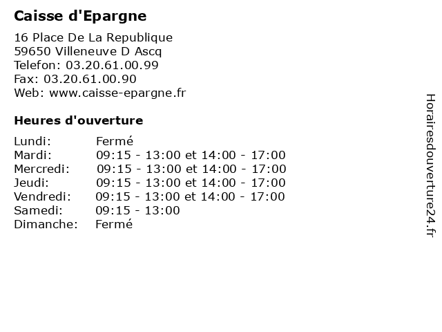 1 Caisse d'Epargne (Distance: 2,63 km) 233 Rue Roger Salengro, 59000 Hellemmes banque, caisse, compte, credit, d'epargne, d'épargne, finance, trésorerie 2 Caisse d'Epargne (Distance: 4,04 km) 171 Rue Pierre Legrand, 59800 Lille banque, caisse, carte, d'epargne, services 3 Caisse D'epargne (Distance: 4,09 km) 15 Place Du Mont De Terre, 59800 Lille banque, caisse, carte, d'epargne, services 4 Caisse d'Epargne (Distance: 5,31 km) 8 Place de la République, 59170 Croix banque, caisse, carte, d'epargne, services 5 Caisse d'Epargne (Distance: 5,46 km) 13 Place Lisfranc, 59700 Marcq en Baroeul banque, caisse, carte, d'epargne, services 6 Caisse d'Epargne (Distance: 5,71 km) 33 Avenue Kennedy, 59000 Lille banque, caisse, carte, d'epargne, services |