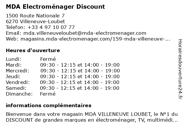 1 MDA Electroménager Discount (Distance: 7,02 km) 2900 Chemin de Saint-Bernard, 06220 Vallauris discount, electroménager, mda 2 MDA Electroménager Discount (Distance: 14,99 km) 45 Rue de Roquebillière, 06300 Nice discount, electroménager, mda 3 MDA Electroménager Discount (Distance: 15,38 km) 12 Route de Cannes, 06130 Grasse discount, electroménager, mda 4 Cap Discount (Distance: 2,54 km) Espace Marina 7, 06270 Villeneuve Loubet cap, discount, divers, détail, magasins, nra 6 Electroménager J Giordano (Distance: 10,12 km) 418 Avenue Rhin et Danube, 06140 Vence electroménager, giordano |