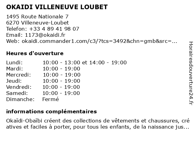 1 OKAIDI CAGNES SUR MER (Distance: 3,28 km) Avenue des Alpes, 06800 Cagnes-sur-Mer bébé garçon, cagnes, chapeau bébé fille, chaussure bébé fille, chaussures fille, chaussures garçon, collant fille, dors bien, manteau bébé fille, manteau bébé garçon, manteau fille, manteau garçon, mer, okaidi, pull fille, pyjama naissance, robe bébé, robe fille, sandale bébé garçon, sur, tenue cérémonie garçon, vêtement bébé fille, vêtements fille, vêtements garçon 2 OKAIDI ANTIBES (Distance: 5,09 km) Chemin de Saint-Claude, 06600 Antibes antibes, bébé garçon, chapeau bébé fille, chaussure bébé fille, chaussures fille, chaussures garçon, collant fille, dors bien, manteau bébé fille, manteau bébé garçon, manteau fille, manteau garçon, okaidi, pull fille, pyjama naissance, robe bébé, robe fille, sandale bébé garçon, tenue cérémonie garçon, vêtement bébé fille, vêtements fille, vêtements garçon 3 OKAIDI NICE (Distance: 12,98 km) Avenue Jean Médecin, 06000 Nice chaussures fille, chaussures garçon, jouet bébé, livre bébé, manteau fille, nice, okaidi, pull fille, robe fille, tenue cérémonie garçon, vêtements fille, vêtements garçon 4 Okaidi (Distance: 12,99 km) 30 Avenue Jean Medecin, 06000 Nice beaute, bijoux, boutiques, chausseur, enfants, maison, mode femmes, mode hommes, okaidi, restaurant, sport 5 OKAIDI CANNES HOCHE (Distance: 13,04 km) 9 Rue Hoche, 06400 Cannes bébé garçon, cannes, chapeau bébé fille, chaussure bébé fille, chaussures fille, chaussures garçon, collant fille, dors bien, hoche, manteau bébé fille, manteau bébé garçon, manteau fille, manteau garçon, okaidi, pull fille, pyjama naissance, robe bébé, robe fille, sandale bébé garçon, tenue cérémonie garçon, vêtement bébé fille, vêtements fille, vêtements garçon 6 Obaibi-Okaidi (Distance: 19,28 km) 21 Route de Fréjus, 06210 Mandelieu casino, centre, commercial, geant, madelieu, obaibi, okaidi |