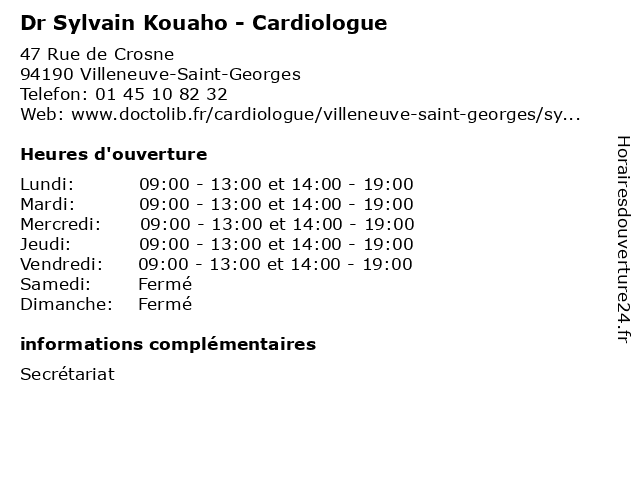1 Dr Bernard Peyret - Cardiologue (Distance: 0,00 km) 47 Rue de Crosne, 94190 Villeneuve-Saint-Georges bernard, cardiologue, clinique, de, docteur, dr, generaliste, georges, générale, medical, peyret, ramsay, saint, santé, soin, villeneuve 2 Dr Fouad El Buhali - Cardiologue (Distance: 0,00 km) 47 Rue de Crosne, 94190 Villeneuve-Saint-Georges buhali, cardio, cardiologie, cardiologue, coeur, dr, el, fouad 3 Sylvain Guerin - Hypnothérapeute (Distance: 2,18 km) 12 Rue du Maréchal Foch, 94480 Ablon-sur-Seine guerin, hypnose, hypnotherapeute, hypnothérapeute, sante, soins, sylvain 4 Dr Sylvain Salem - Chirurgien-dentiste (Distance: 2,84 km) 2 Place Louis Jacquard, 94290 Villeneuve-le-Roi chirurgien, dentaire, dentiste, dr, implantologie, parodontologie, salem, sylvain 5 Dr Christophe Tawa - Cardiologue (Distance: 3,01 km) 111 Rue Caron, 91200 Athis-Mons cardiologue, christophe, dr, médecin, médecine, médical, pharmaceutique, secretariat, tawa, traitement 6 Maître Sylvain Aubert - Notaire (Distance: 4,29 km) 15 bis avenue Gabriel Péri, 94450 Limeil Brevannes aubert, droits, maître, notaire, notaires, patrimoine, spécialistes en droits, sylvain |
