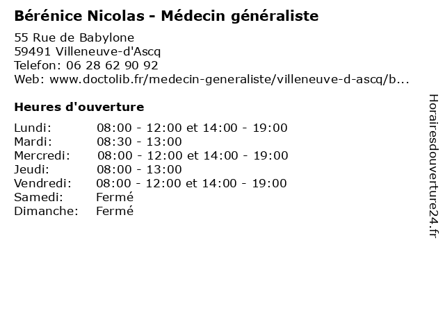 | Mercredi | 08:00-12:00 et 14:00-19:00 |