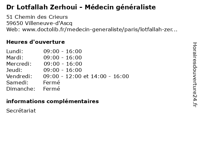 | Vendredi | 09:00-12:00 et 14:00-16:00 |