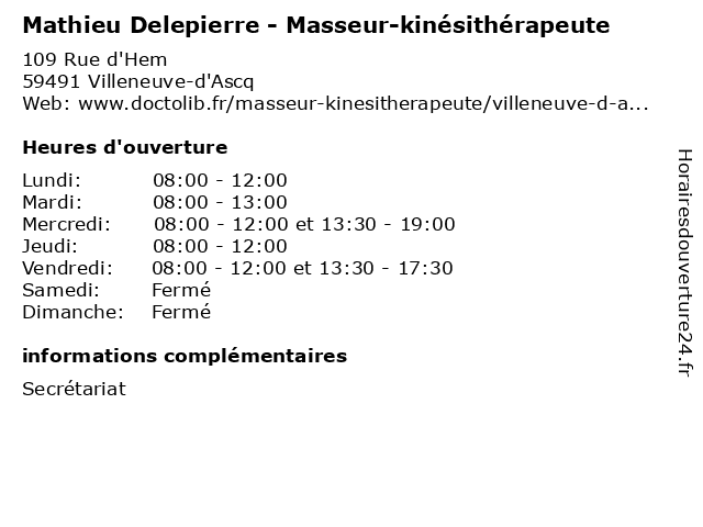 | Mercredi | 08:00-12:00 et 13:30-19:00 |