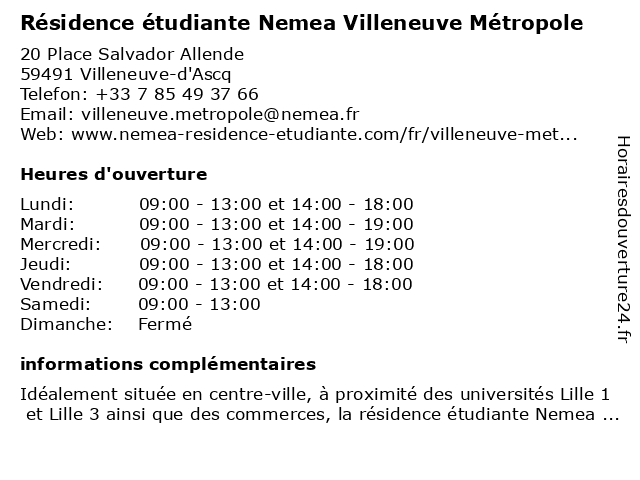 1 Partenord Habitat - Lille Métropole (Distance: 0,14 km) 5 place de Venise, 59650 Villeneuve d’Ascq bailleur, habitat, hlm, lille, location, logement, métropole, partenord, service, social 2 Résidence Le Corbusier (Horaires de remise des clés) (Distance: 0,36 km) 30 rue Verte, 59650 Villeneuve-d'Ascq cafétéria, clés, corbusier, de, des, horaires, le, remise, restaurant, résidence, universitaire 3 Résidence étudiante Studéa Lille Cité Scientifique (Distance: 0,73 km) 12 Rue des Fusillés, 59650 Villeneuve-d'Ascq cité, lille, résidence, scientifique, studéa, étudiante 4 Twenty Campus Villeneuve d'Ascq - Résidence étudiante - Résidence hôtelière (Distance: 0,75 km) 231 Boulevard de Tournai, 59650 Villeneuve-d'Ascq campus, d'ascq, hôtelière, location étudiante, logement étudiant, résidence, résidence hôtelière, résidence étudiante, twenty, villeneuve, étudiante 5 Résidence Pythagore (Horaires de remise des clés) (Distance: 1,10 km) - Avenue Paul Langevin, 59650 Villeneuve-d'Ascq cafétéria, clés, de, des, horaires, pythagore, remise, restaurant, résidence, universitaire 6 Résidence Hélène Boucher (Horaires de remise des clés) (Distance: 1,10 km) - Avenue Paul Langevin, 59650 Villeneuve-d'Ascq boucher, cafétéria, clés, de, des, horaires, hélène, remise, restaurant, résidence, universitaire |