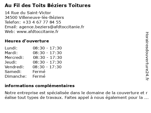 2 Ô Toits Occitans Béziers (Distance: 4,30 km) 101 Avenue Rhin et Danube, 34500 Béziers béziers, occitans, toits 4 Au Fil du Temps by le Coffee Shop (Distance: 27,99 km) 21 Cours Mirabeau, 11100 Narbonne au, barista, by, coffee, du, fil, le, narbonne, restaurants, shop, temps 5 Au Fil et à Mesure (Distance: 28,69 km) 34 Grande Rue, 05130 Valserres au, création, et, fil, mercerie, mesure, puériculture, sacs 6 Restaurant Au Fil de l'Eau (Distance: 29,81 km) 6 Boulevard Victor Hugo, 11430 Gruissan 'eau, au, brasserie, de, eau, fil, l'eau, patrice, restaurant, restaurants, restauration, roussie, traditionnel |