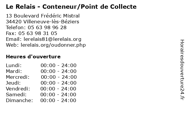 1 Le Relais - Conteneur/Point de Collecte (Distance: 0,25 km) - Chemin Departemental 37, 34420 Portiragnes collecte, conteneur/point, de, dons, le, point, relais, vêtements 2 Le Relais - Conteneur/Point de Collecte (Distance: 0,29 km) 17 Rue Balzac, 34420 Villeneuve-lès-Béziers collecte, conteneur/point, de, dons, le, point, relais, vêtements 3 Le Relais - Conteneur/Point de Collecte (Distance: 0,31 km) 28 Boulevard Gambetta, 34420 Villeneuve-lès-Béziers collecte, conteneur/point, de, dons, le, point, relais, vêtements 4 Le Relais - Conteneur/Point de Collecte (Distance: 0,39 km) 5 Boulevard Pasteur, 34420 Villeneuve-lès-Béziers collecte, conteneur/point, de, dons, le, point, relais, vêtements 5 Le Relais - Conteneur/Point de Collecte (Distance: 0,58 km) 6 Avenue de la Gare, 34420 Villeneuve-lès-Béziers collecte, conteneur/point, de, dons, le, point, relais, vêtements 6 Le Relais - Conteneur/Point de Collecte (Distance: 0,85 km) - Rue Source, 34420 Villeneuve-lès-Béziers collecte, conteneur/point, de, dons, le, point, relais, vêtements |