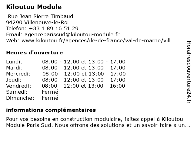 1 Kiloutou Module Paris Sud (Distance: 0,01 km) Rue Jean Pierre Timbaud, 94290 Villeneuve-le-Roi kiloutou, location base vie, location bungalow chantier location bureau préfabriqué, location bureau de chantier, location construction modulaire, location container, location conteneur, location modulaire, location préfabriqué, location salle de classe, module, paris, sud 3 Kiloutou (Distance: 6,33 km) s/n Route du Fief Cordelier, 94380 Bonneuil Sur Marne divers, détail, kiloutou, magasins, materiel, medical, nra 6 Kiloutou (Distance: 13,93 km) Avenue de l'Hurepoix, 91700 Sainte-Geneviève-des-Bois air, construction, energie, entreprise, kiloutou, manutention, matériaux, professionnel, société, transport |