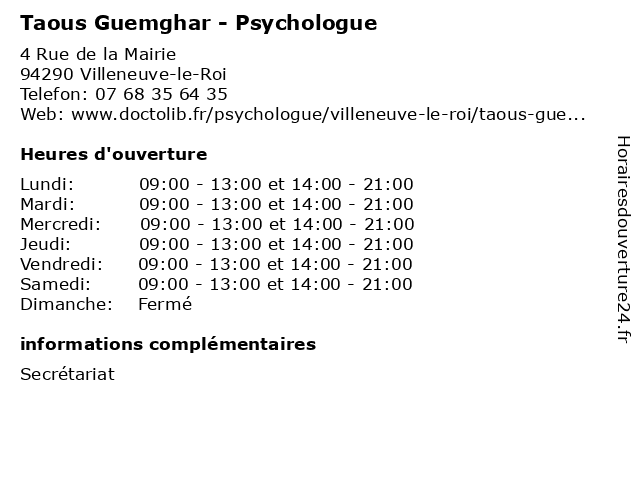Lundi | 09:00-13:00 et 14:00-21:00 |